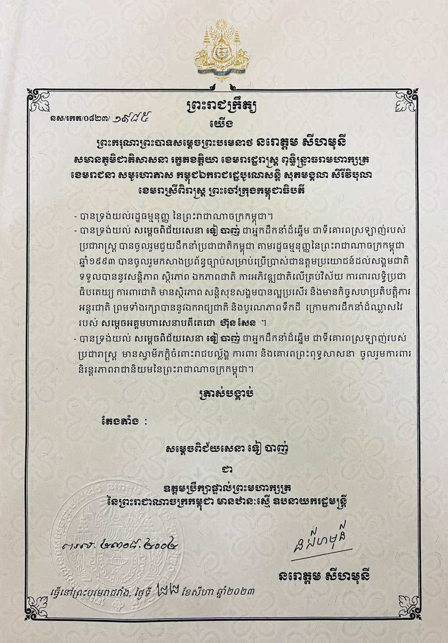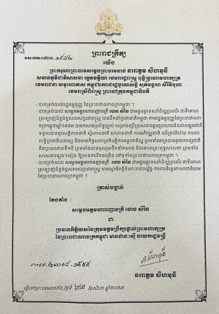 Hours after losing the prime minister’s position, Kandal lawmaker Hun Sen was appointed the president of the Supreme Privy Council to the King. King Norodom Sihamoni signed the document on August 22, with Hun Sen taking over from the late Norodom Ranariddh who was the previous head of the council.