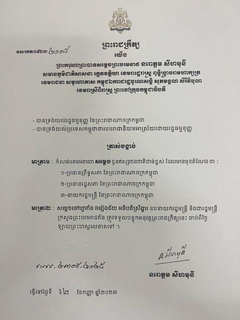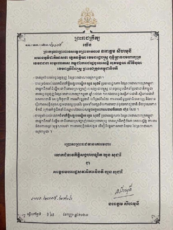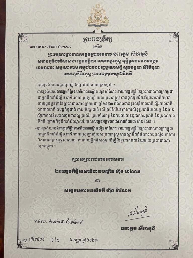 The decree, signed by King Norodom Sihamoni on September 2, follows a Royal Academy of Cambodia title granted to Hun Manet last month, “kitti tesaphibal pundit,” in another royal decree dated August 8.