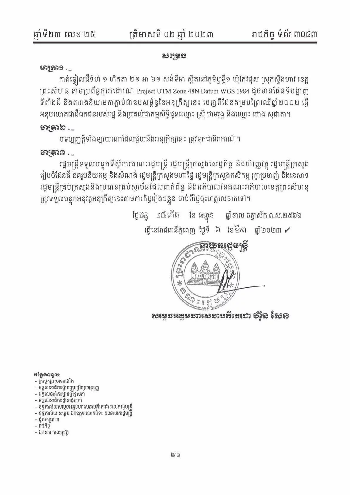 According to a sub-decree dated March 6, 2023 in book 25 of the Royal Gazette, released on September 4, then-Prime Minister Hun Sen reclassified 1.2 hectares of state forest Stung Hav district’s Keo Phos commune to state private land to be handed over to Sry Thamarong and Thorng Socheata.